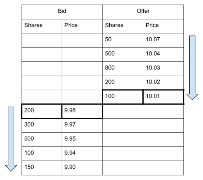 On the other hand, the lowest priced offer is considered the top-of-book order. Therefore, in the example above, the top-of-book offer is for 10.01.