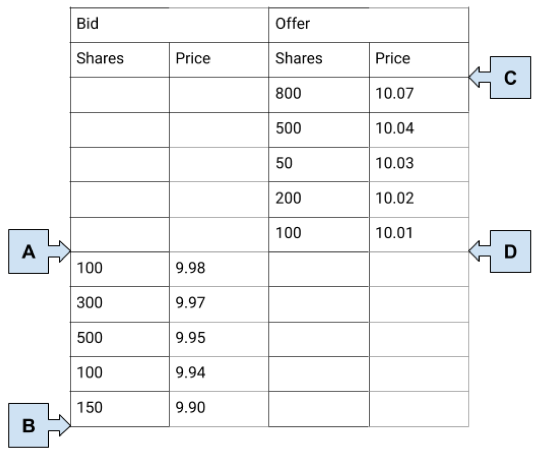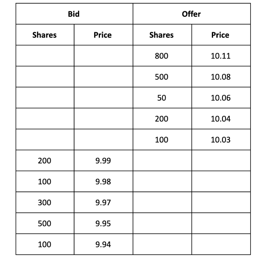 1. order to sell 50 shares at $10.032. order to sell 800 shares at $10.073. order to sell 100 shares at $10.014. order to buy 100 shares at $9.98